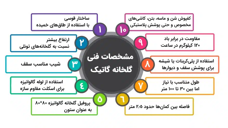 مشخصات فنی گلخانه اسپانیایی (سازه، ارتفاع، قوس سقف، متریال)