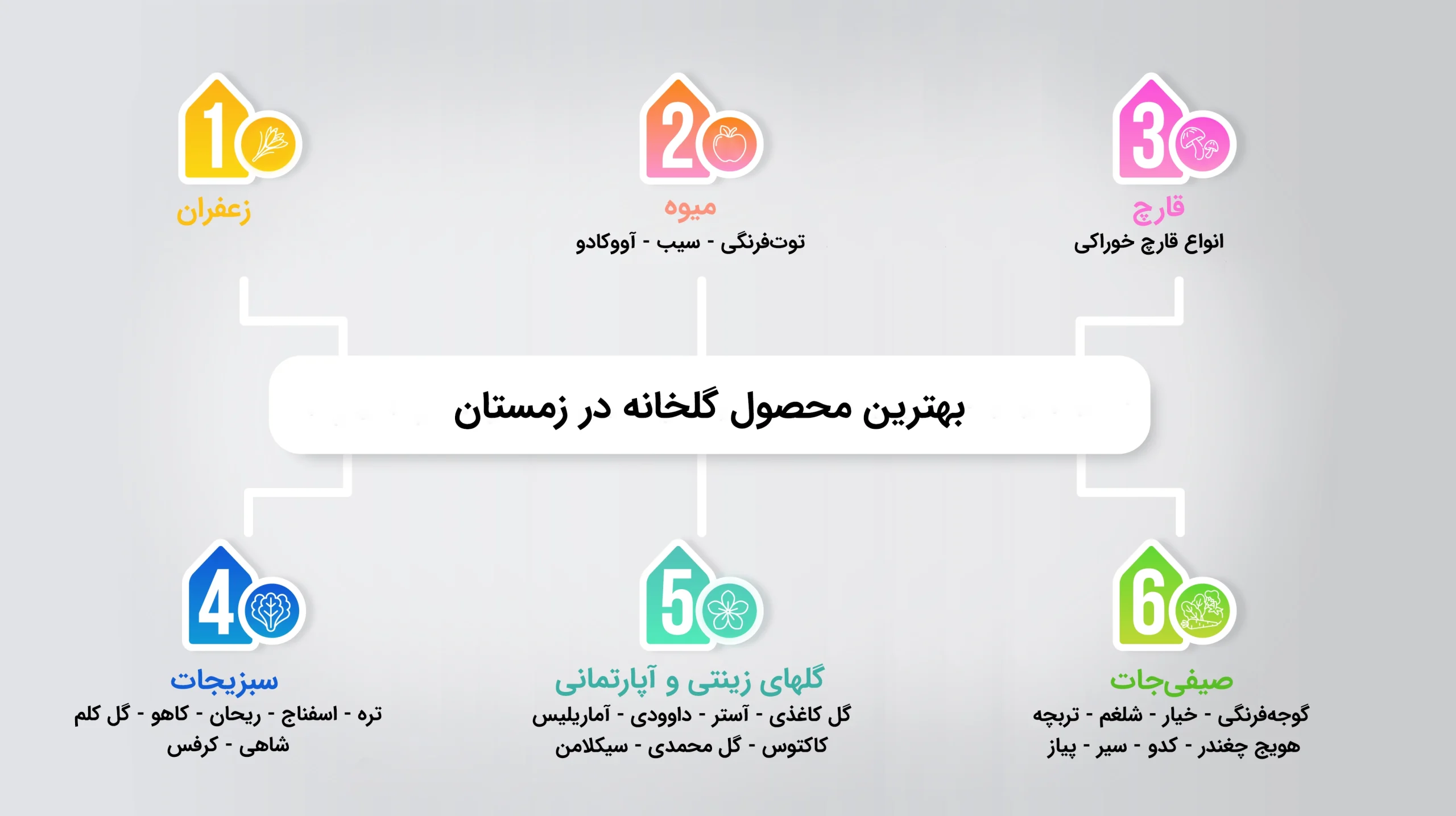 کشت گلخانه ای محصولات، امکان دسترسی به آنها را فارق از محدودیت فصلی، فراهم میکند. انتخاب بهترین محصول برای کشت در فصل زمستان به عوامل مختلفی مانند نوع گلخانه و موقعیت جغرافیایی بستگی دارد. شرایط آب و هوایی منطقه میتواند به گونهای باشد که زمان برداشت محصولات بیشتر از حالت عادی طول بکشد. با این حال، برخی محصولات در صورت برنامهریزی دقیق و آمادهسازی مناسب، در اغلب گلخانهها رشد مطلوبی داشته و نتیجه خوبی ارائه میدهند.